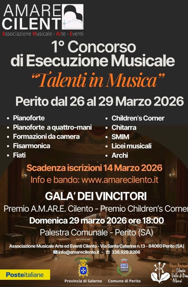 L'Associazione A.M.AR.E. Cilento, dopo i successi delle rassegne “Cilento PianoFest” e “Musica Classica nei Borghi”, prosegue il suo impegno nella divulgazione della cultura musicale nel territorio cilentano attraverso la prima edizione del Concorso Musicale "Talenti in Musica".